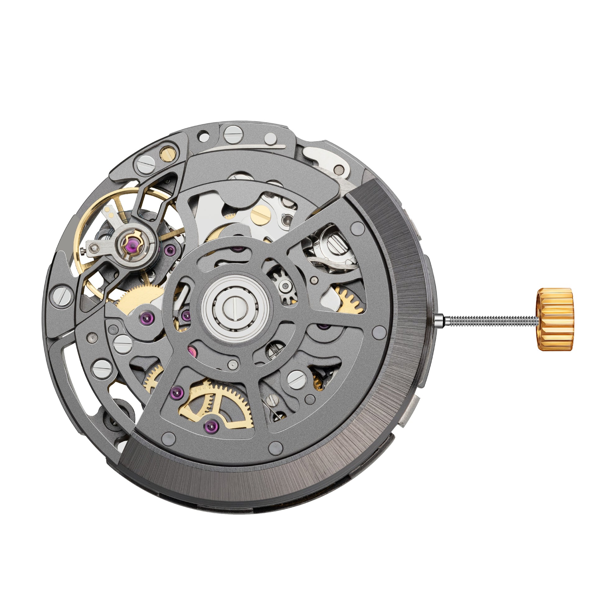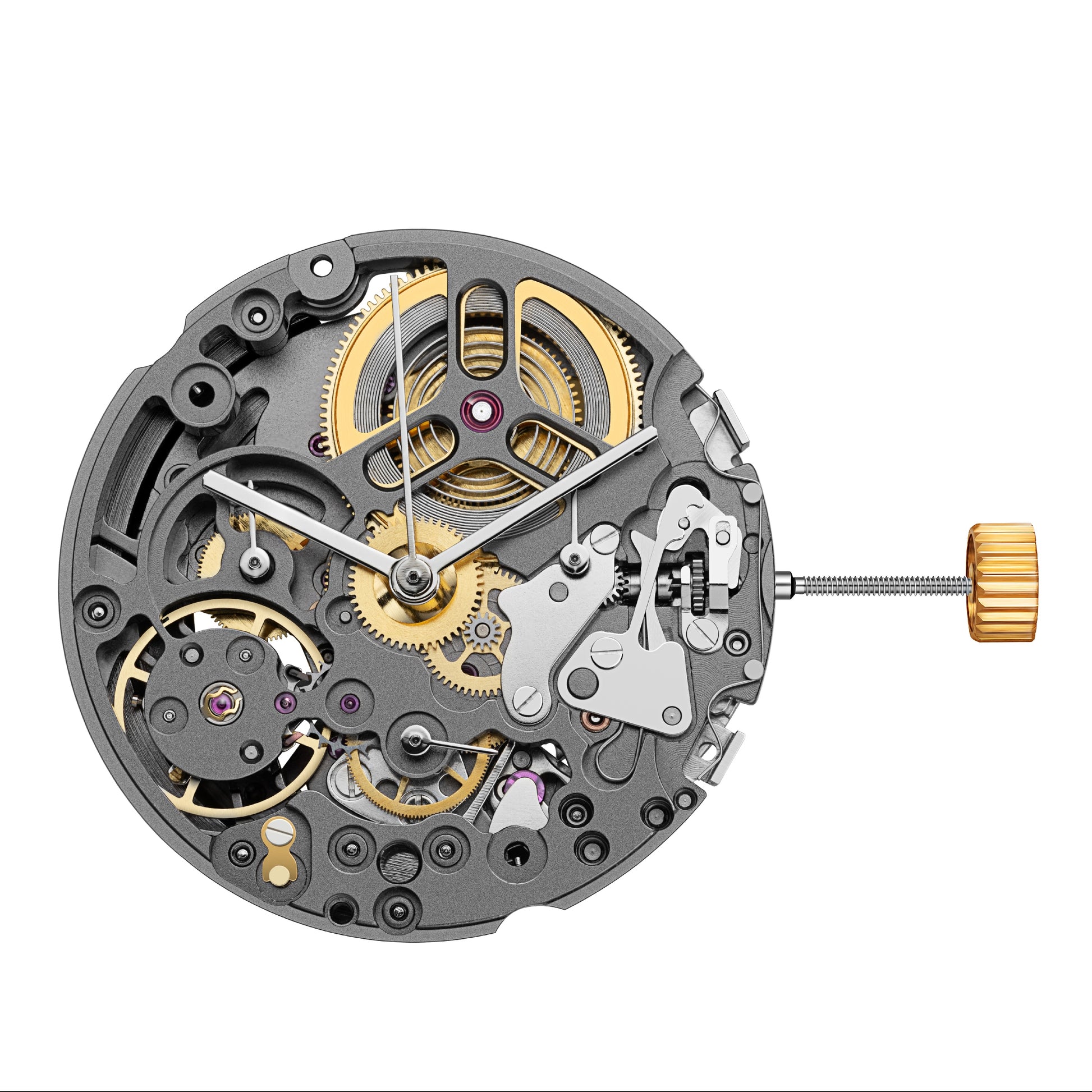 Center Hr/Min/Chrono Sec hands; 3H: Chrono 30 Mins; 6H: Small Sec; 9H: Chrono 12 Hrs; Skeleton movement; Auto & Hand winding; Stop Sec; |